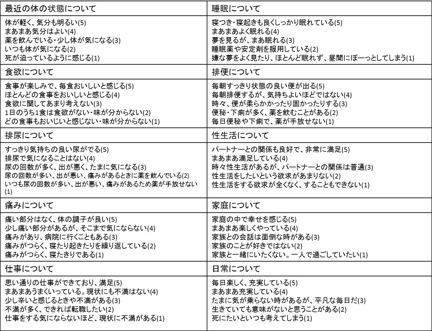 1~4は肉体的な健康状態に関する項目ですが、5は心の奥底からの幸福感による精神的な健康状態を指しています。