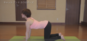 ①両ひざ・両手が肩幅になるように地面につく。息を吐きながら、背中を丸めてお腹をへこませる。顔は下向き。