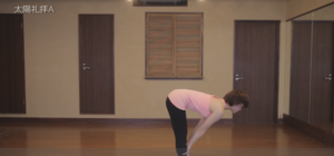 ⑧吐く息で目線を斜め上へ、吸う息で足を一歩ずつ前へ出し、半分の前屈に戻る。