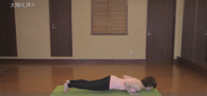 ⑤手を床につき、右足、左足を一歩ずつ後ろに蹴り出し、吐く息で、身体の8点(両手・両つま先・両ひざ・胸・顎)を床につける。大地から太陽熱を吸収します。息を止めましょう。